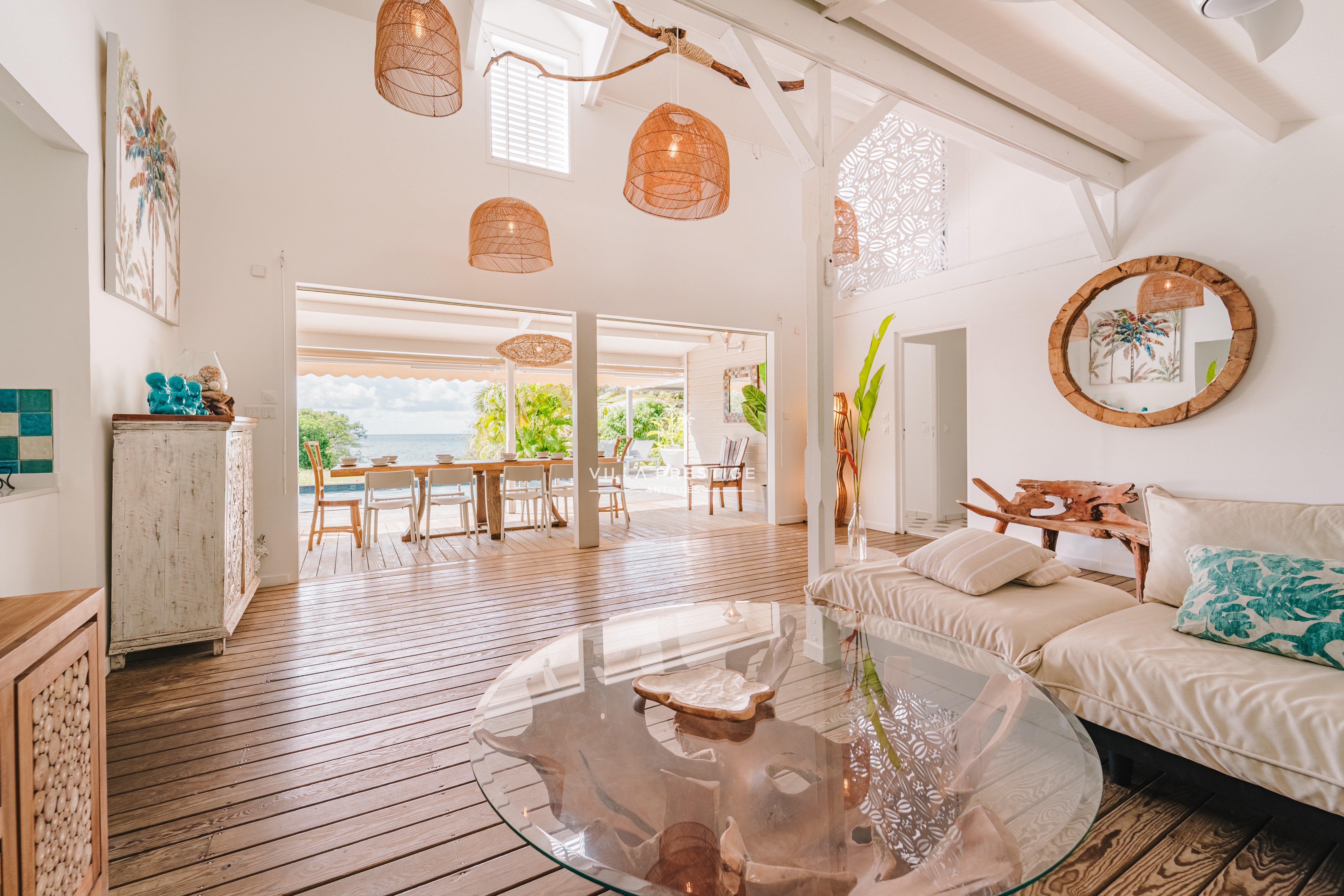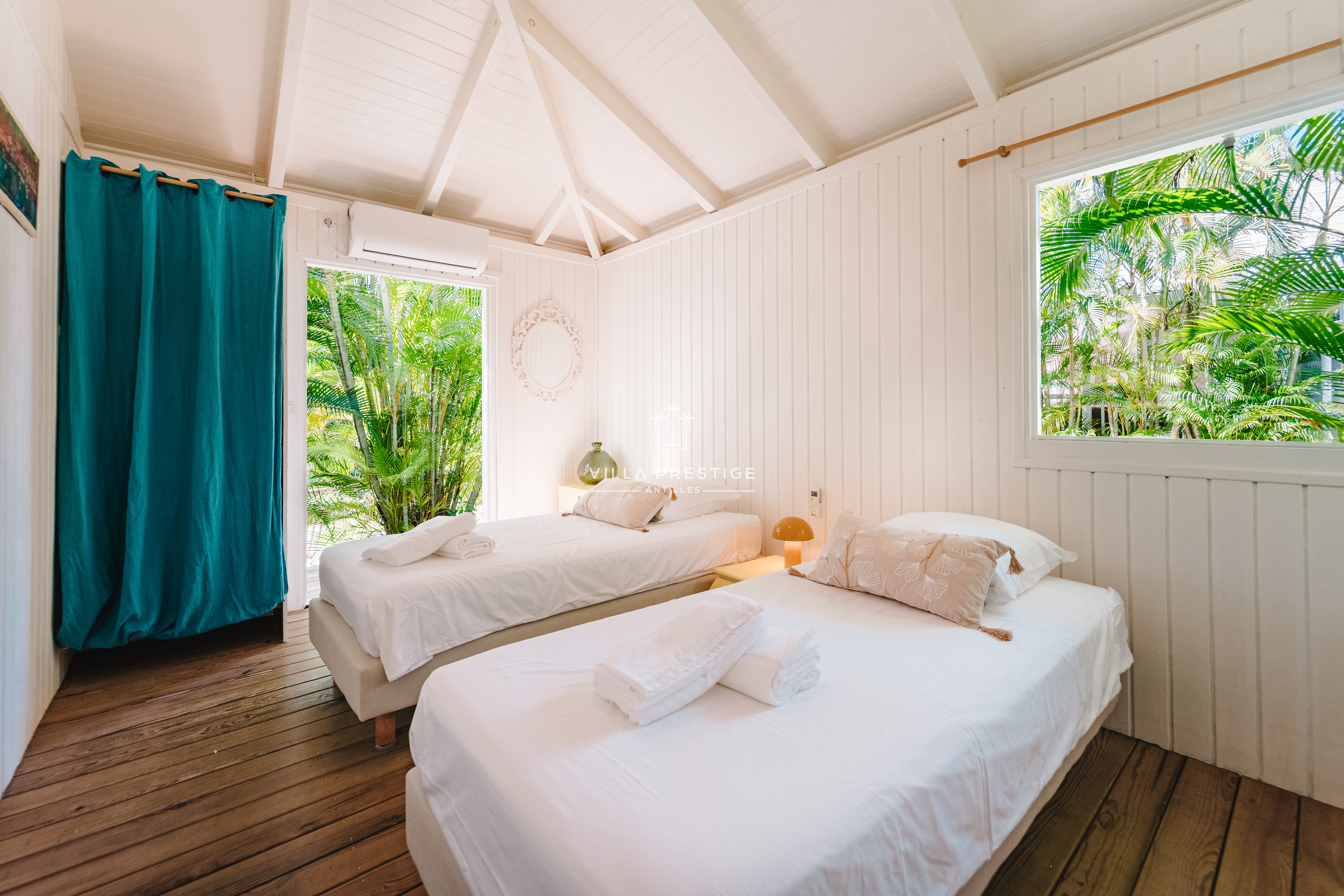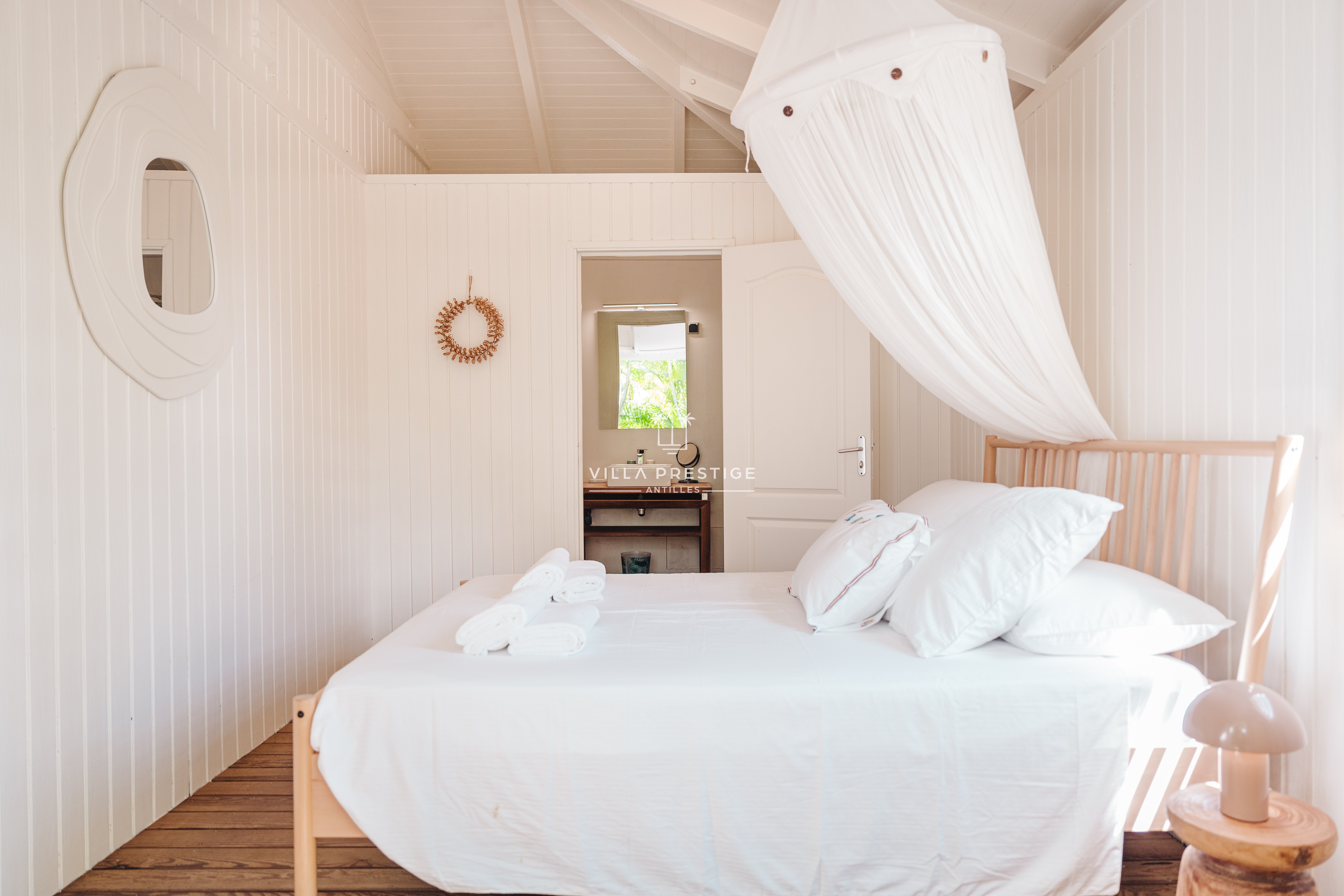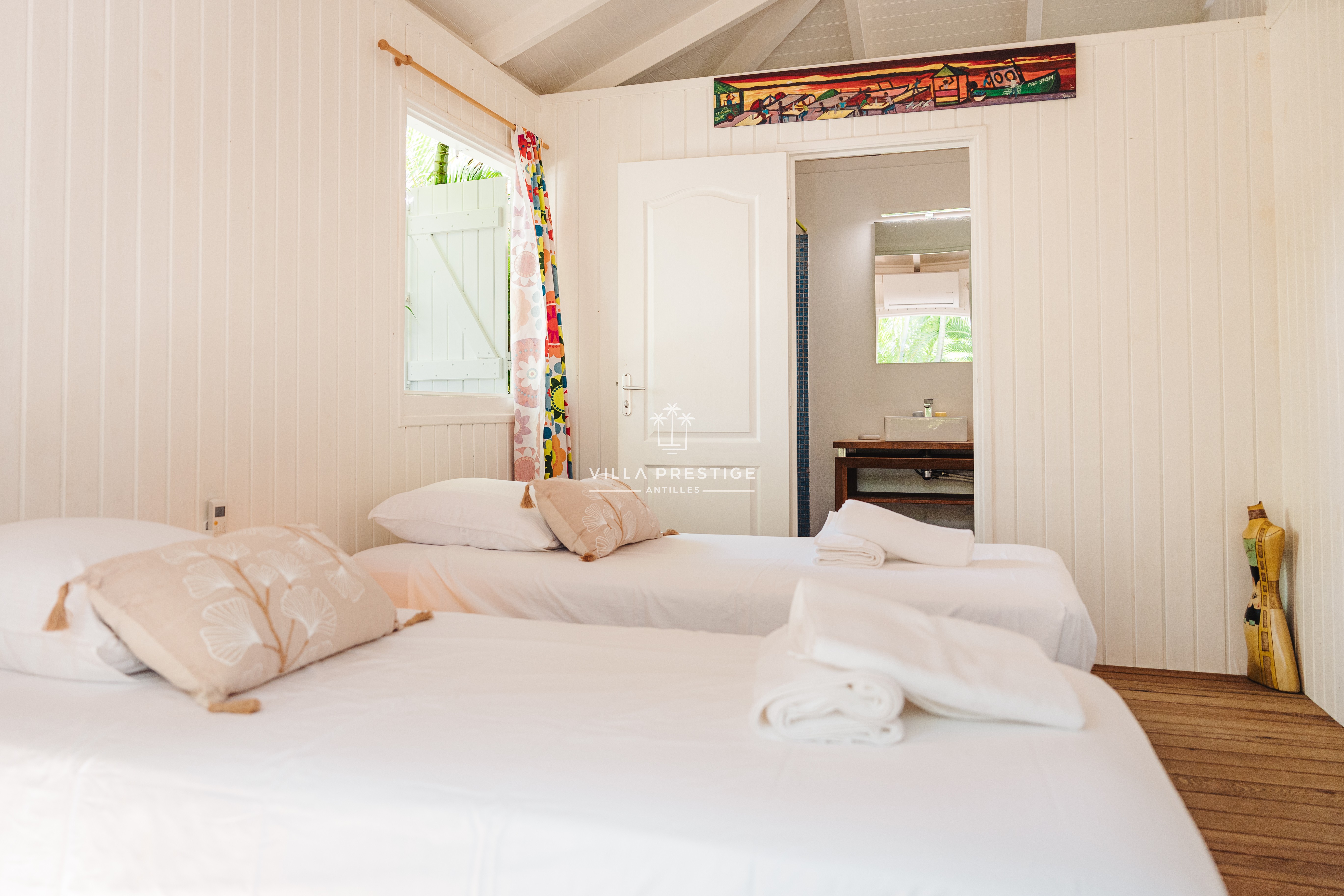 Conçue pour accueillir jusqu’à 12 personnes, Désir des Îles allie confort, convivialité et style caribéen. La villa dispose de 6 chambres climatisées, chacune pensée pour votre bien-être, réparties entre la maison principale et deux bungalows en bois.