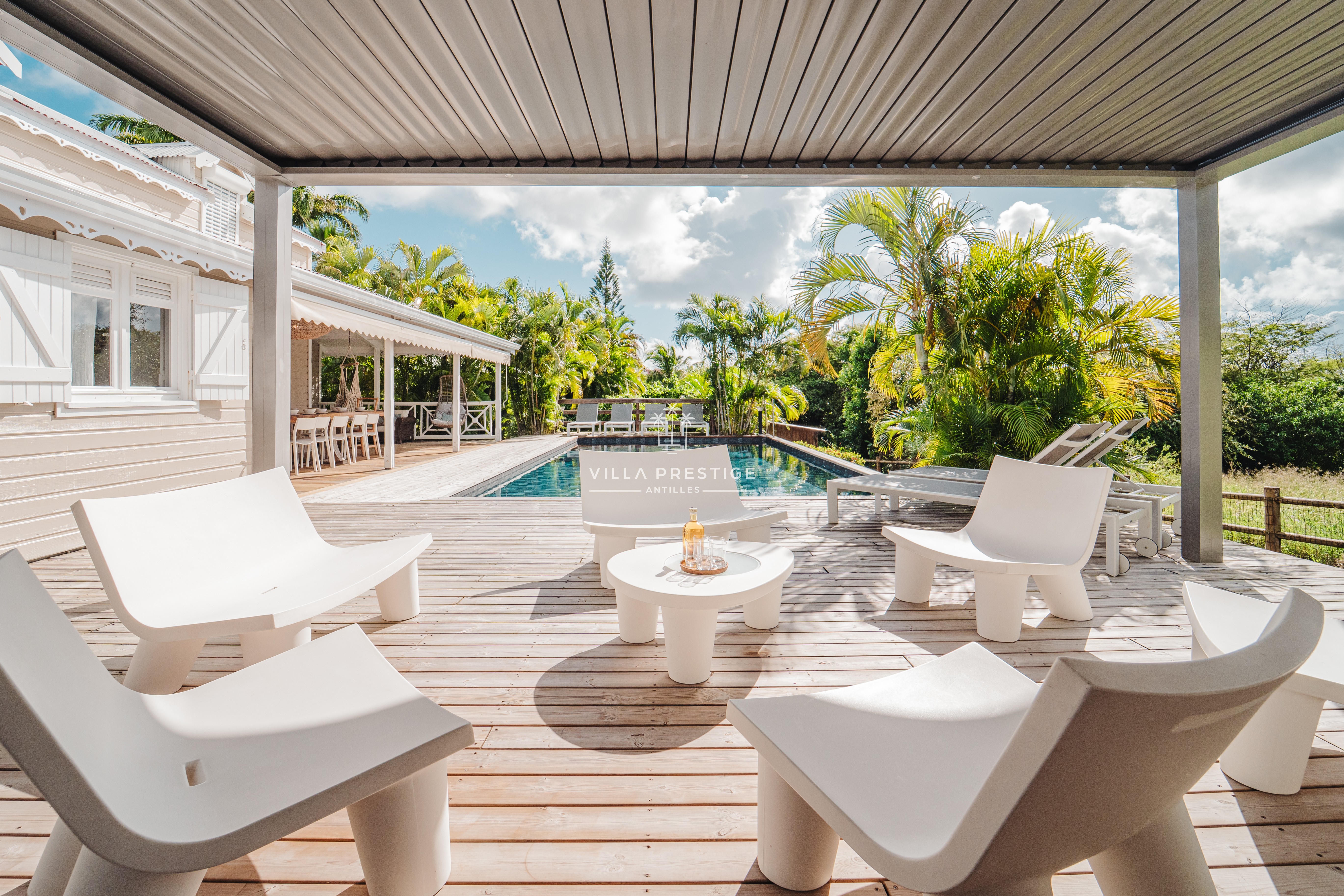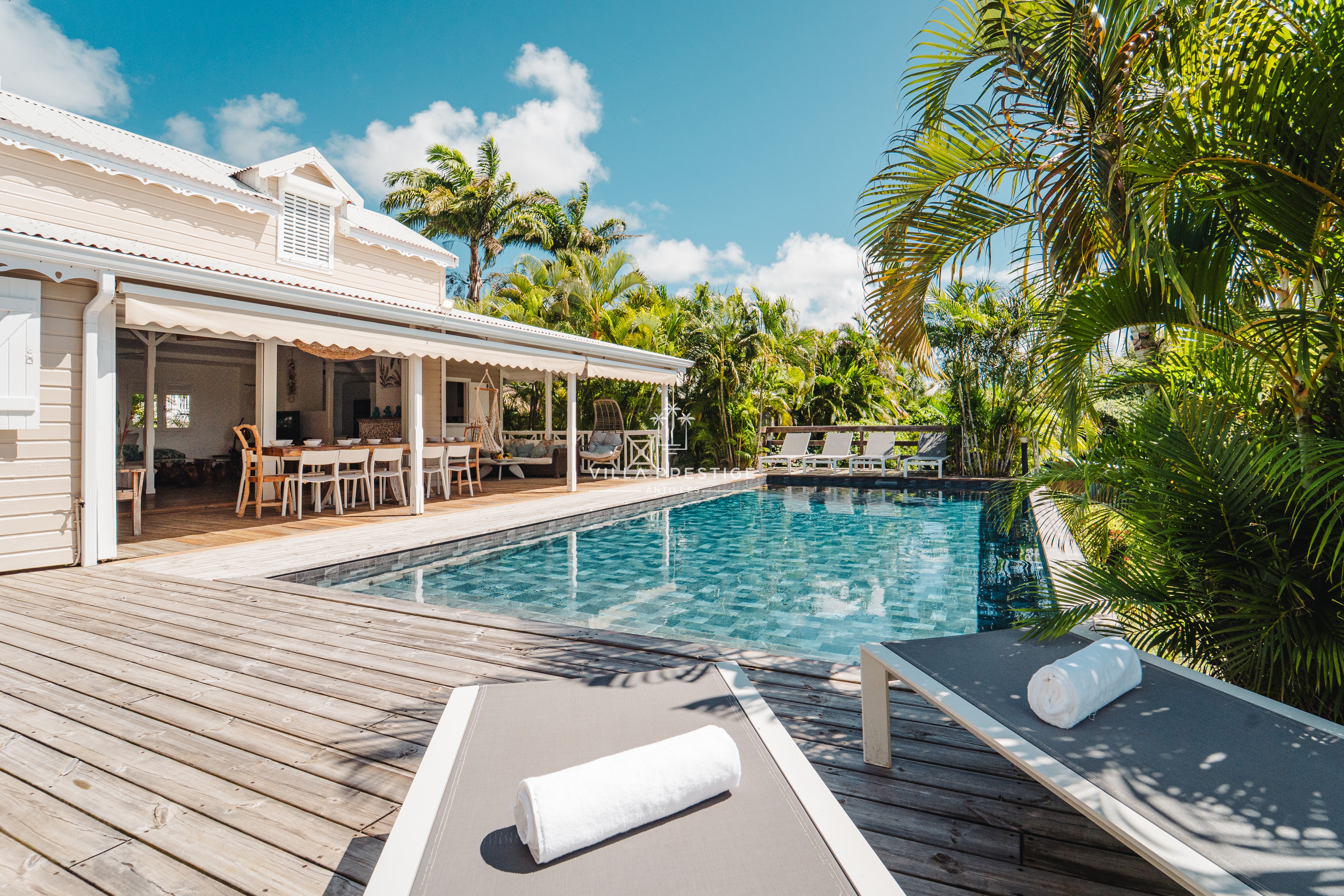 Profitez d’un jardin luxuriant, d’une piscine privée entourée de transats, de terrasses ombragées et d’un carbet équipé de hamacs — parfait pour se détendre au rythme des alizés.