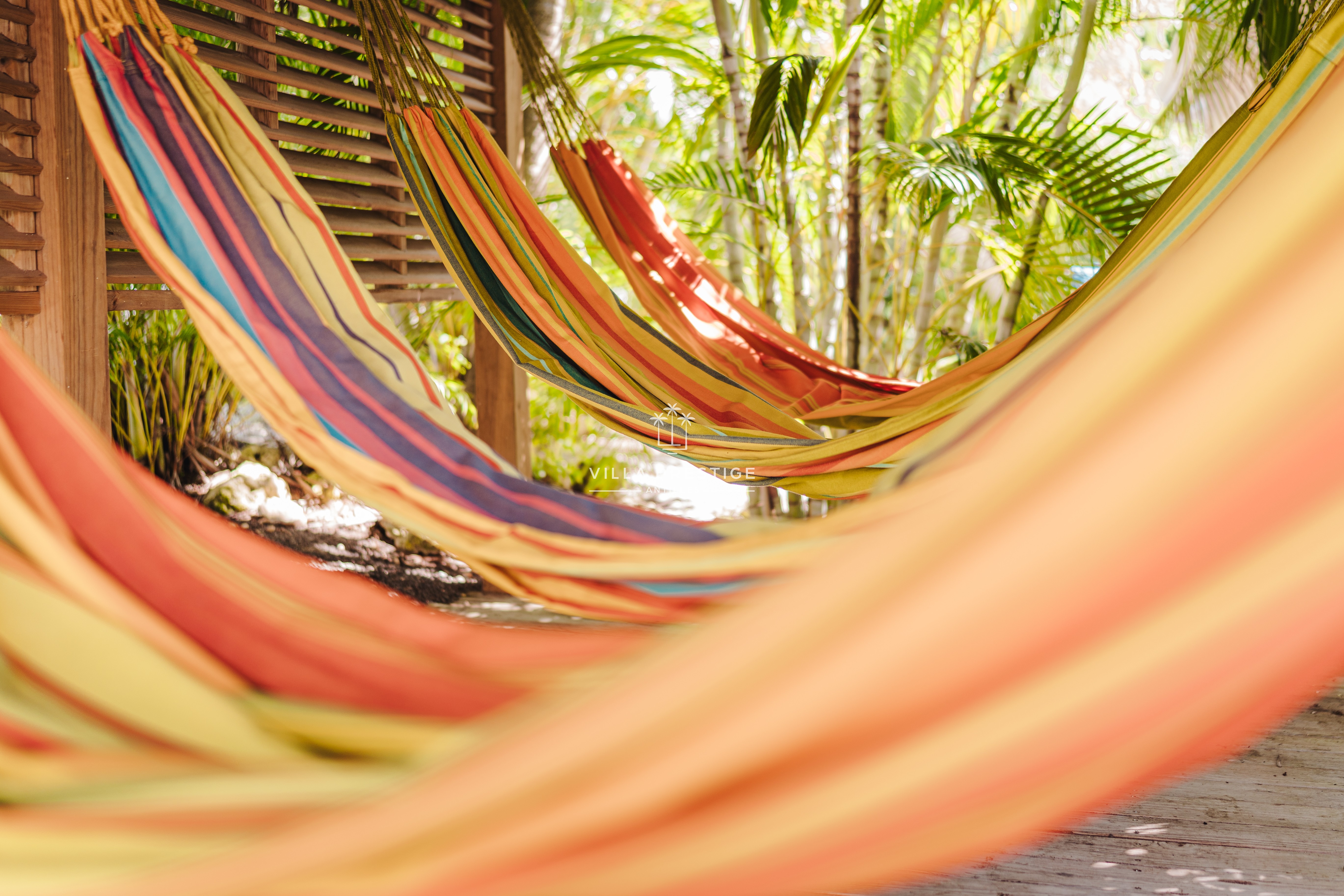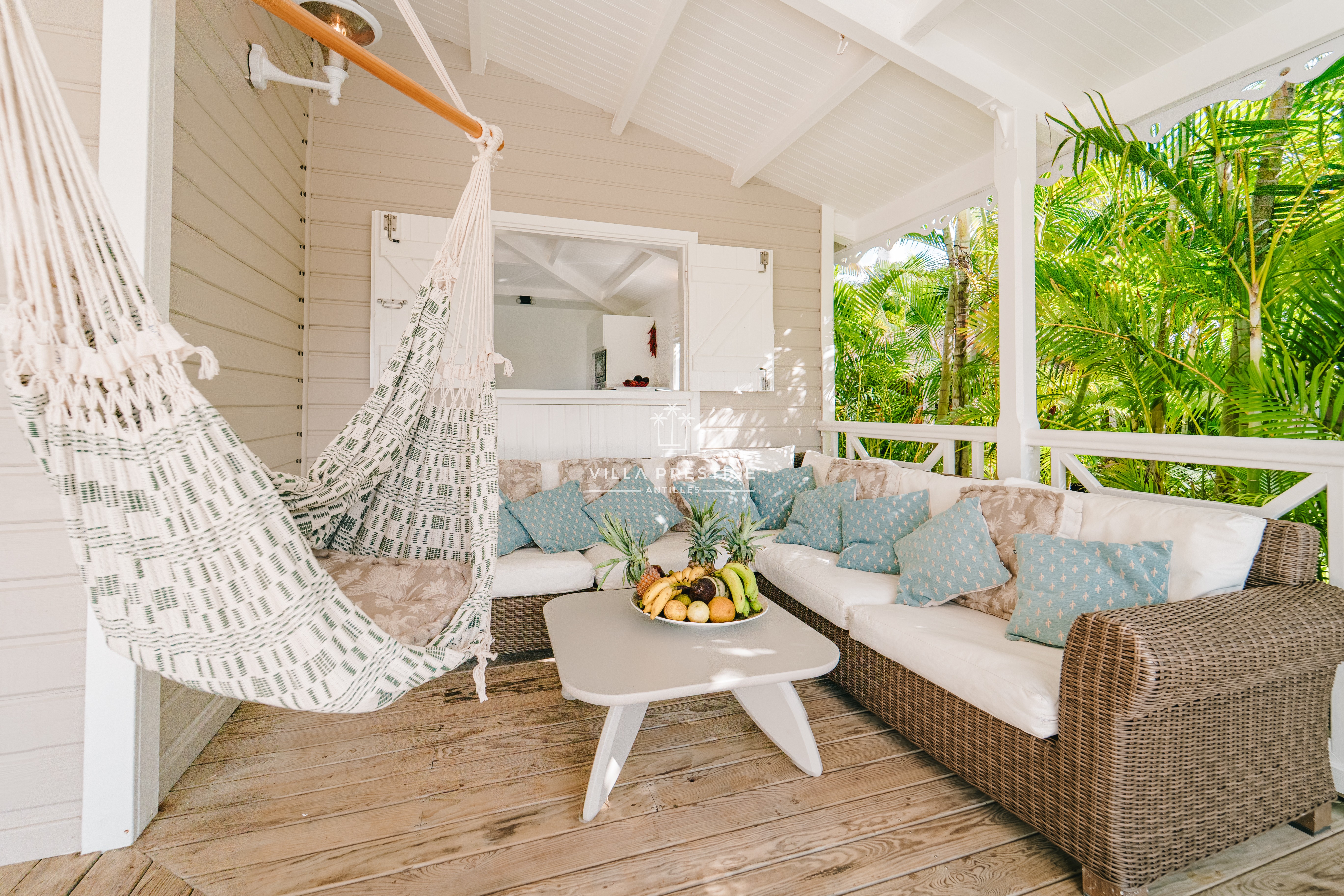 Plusieurs coins détente : salon sous la terrasse, espace apéritif au coucher de soleil, carbet avec hamacs
