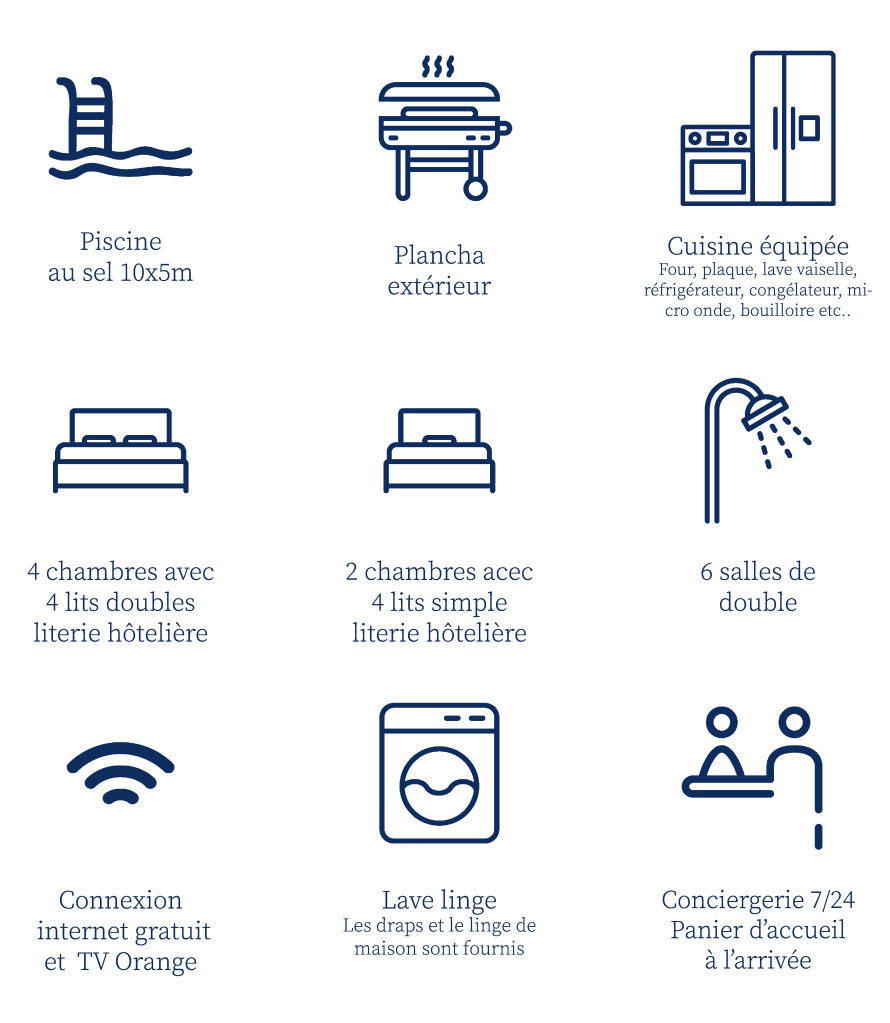La villa a été pensée et conçue pour vivre dehors. C’est avant toute chose, une villa familiale faite pour le partage. Douceur de vivre, calme et confort en sont ses principaux atouts. Sa terrasse en teck et sa piscine sont une invitation à la paresse et à la détente. A seulement 2 minutes à pied de la plage.